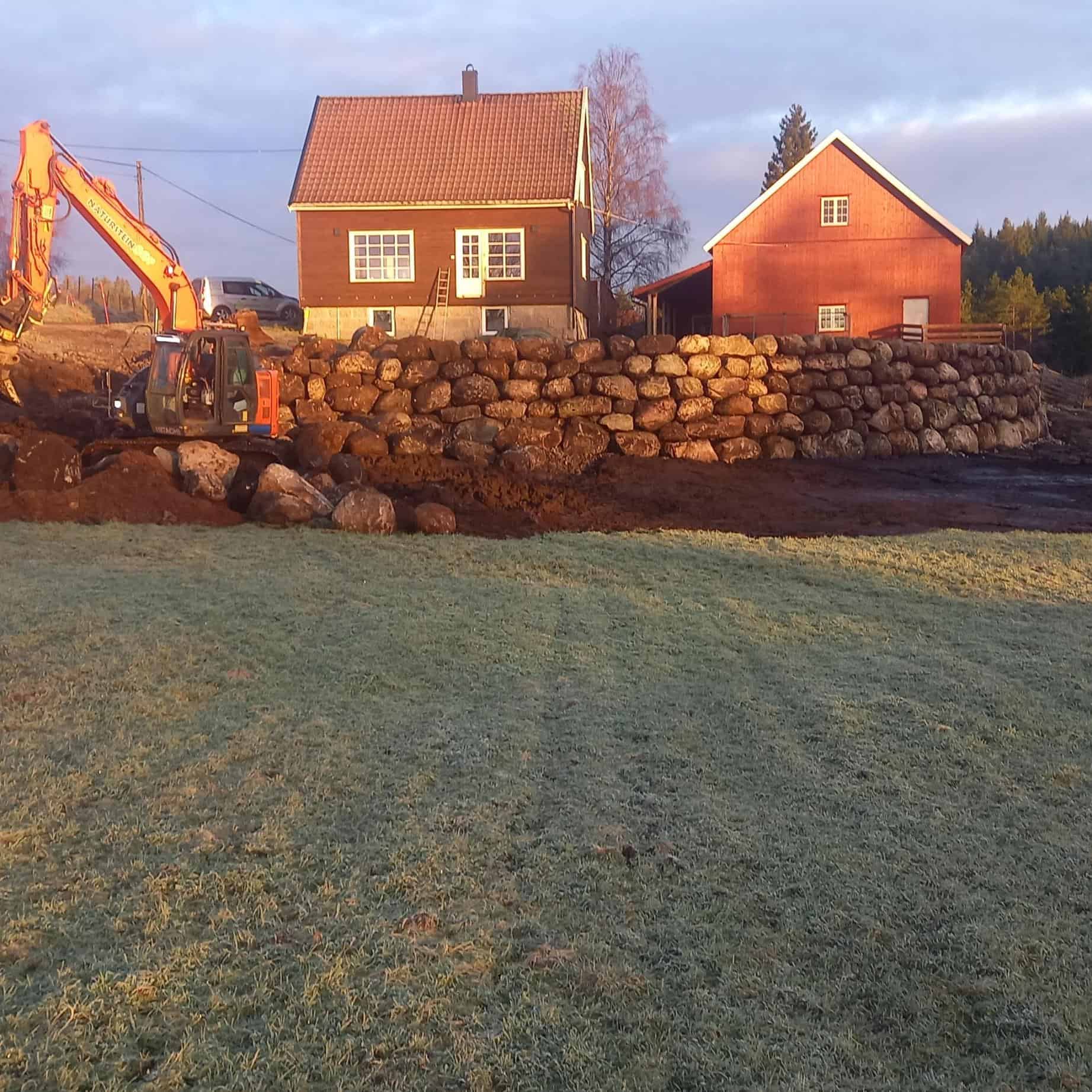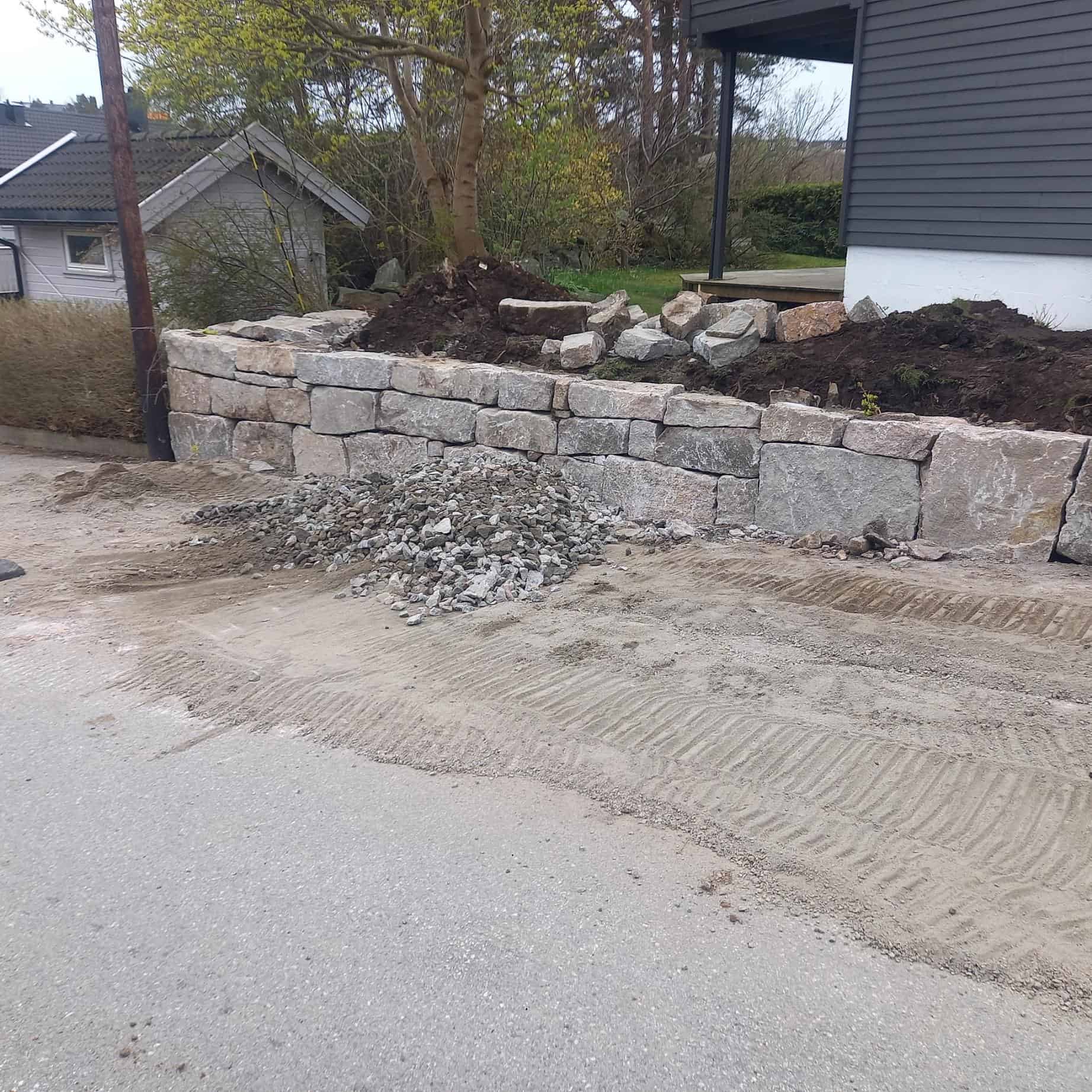 Vi setter opp natursteinsmurer i ulike størrelser og stiler. Steinen håndteres med gravemaskin, rotortilt og klype for presis plassering og et solid resultat. Murene brukes til terrengtilpasning, støttemurer og trapper. Vi tilbyr løsninger i flere prisklasser, og arbeidet kan utføres i én operasjon med utgraving, oppsetting og tilbakefylling.